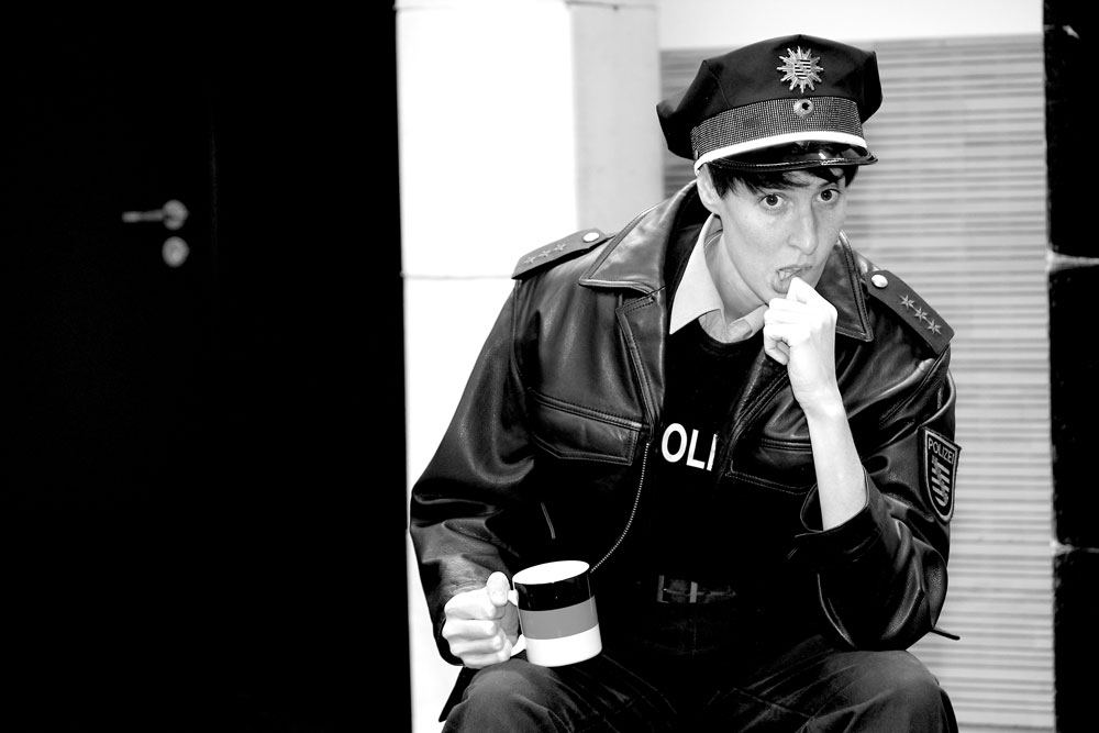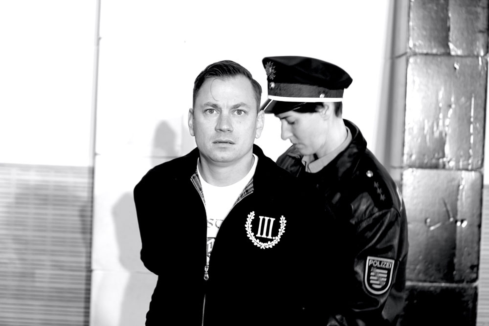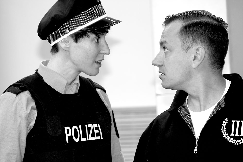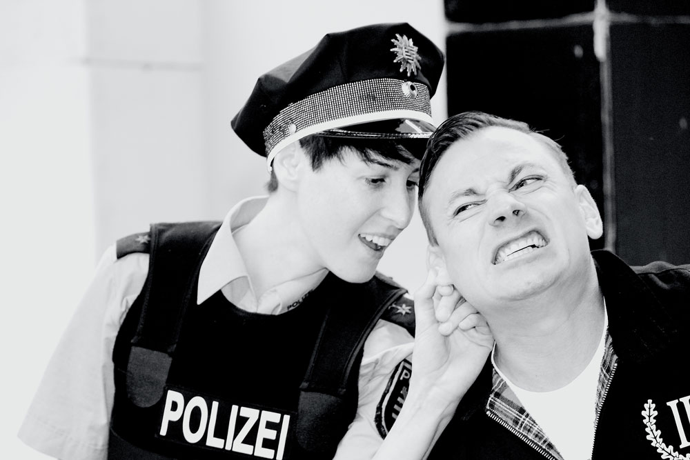 „ Ich bin stolz ein Deutscher zu sein! „ erklärt uns Rudi. Er trägt Bomberjacke, ein T-Shirt mit einschlägiger Aufschrift und Springerstiefel – das typische Bild eines Neonazis. Rudi ist jung und arbeitslos. Nach einer Schlägerei landet er gemeinsam mit Jan, Ausländer und Schwarzarbeiter in Haft. Kulturen, Ideologien und Hass treffen aufeinander. Ein Spießrutenlauf beginnt. Jeder präsentiert dem anderen seine Vorurteile. Entsprechend heizt sich die Atmosphäre auf. Verbal und körperlich rechnen beide miteinander ab. Doch als die Polizistin Tina ihnen mitteilt, dass ein Arbeitskollege von Jan an den Folgen seiner Verletzungen verstorben ist kippt die Stimmung auf der Bühne und im Zuschauerraum. Diese Nachricht bringt beide zum Nachdenken und emotional näher. Wird Rudi, als Jüngster, die Schuld auf sich nehmen und wird Jan aussagen, dass Rudi nicht zugeschlagen hat, sondern sein Anführer Christian? Wo gerade noch über gängige Klischees gelacht wurde, werden nun nicht wenige überlegen wo das Gelächter ein Ende haben muss. Hallo Nazi ist auch ein Stück über den Umgang mit rechten Gewalttaten in unserer Gesellschaft.